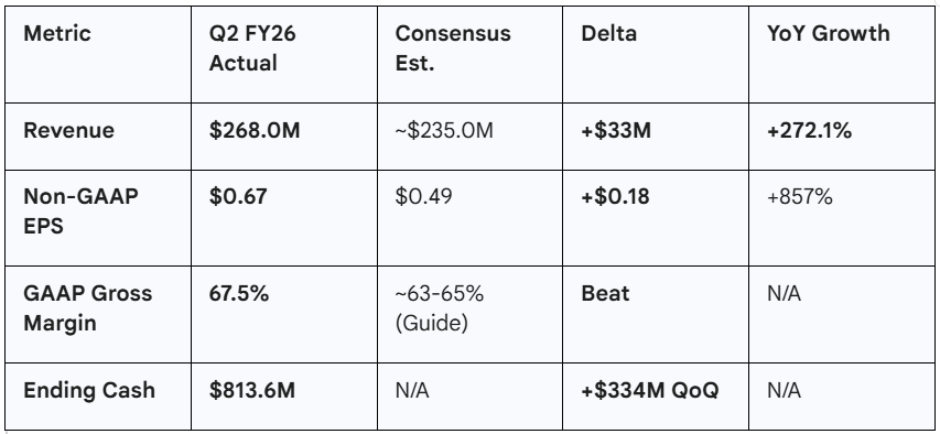 The company delivered a “perfect” quarter: a massive beat on top-line revenue ($268M vs. ~$235M cons), a significant beat on profitability (Non-GAAP EPS $0.67 vs $0.49 cons), and a guidance raise for Q3 that suggests the ramp is accelerating, not slowing.1